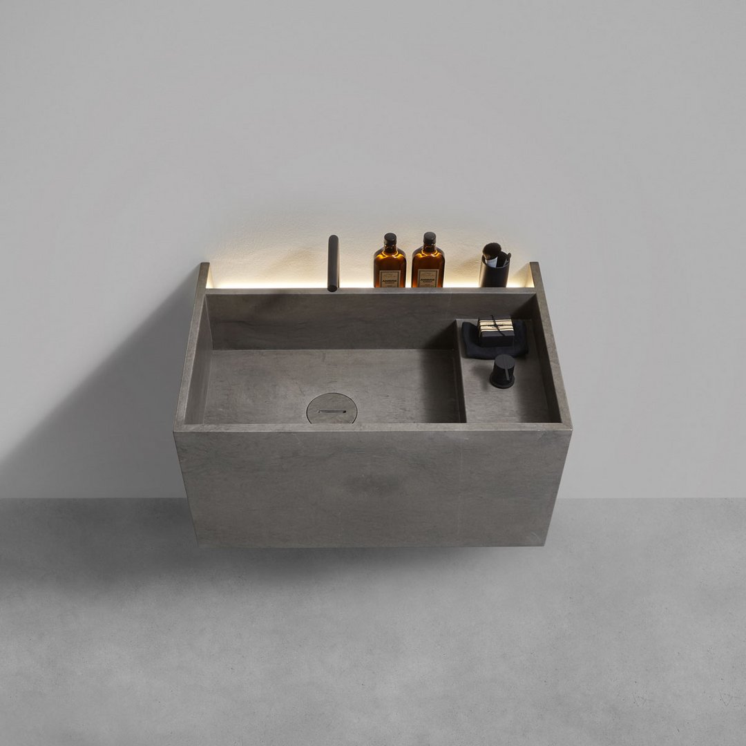 Le forme sono squadrate, le linee ortogonali disegnano geometrie pure e definiscono volumi con funzionalità diverse, lo spazio viene utilizzato al meglio grazie a proporzioni equilibrate, spessori sottili e altezze misurate. Le dimensioni disponibili e le combinazioni di configurazione rendono unico ogni lavabo. La pietra è la grande protagonista di questi monoliti, la forma di MyStreet nasce dalla conoscenza del materiale e dal lavoro dell’uomo per dargli una forma contemporanea. La collezione prende vita dalla serie di top già presentata da antoniolupi e proprio per questo oltre al bacino del lavaggio si predispone per contenere oggetti d’uso quotidiano che trovano posto in uno spazio dedicato e illuminato vicino alla parte.