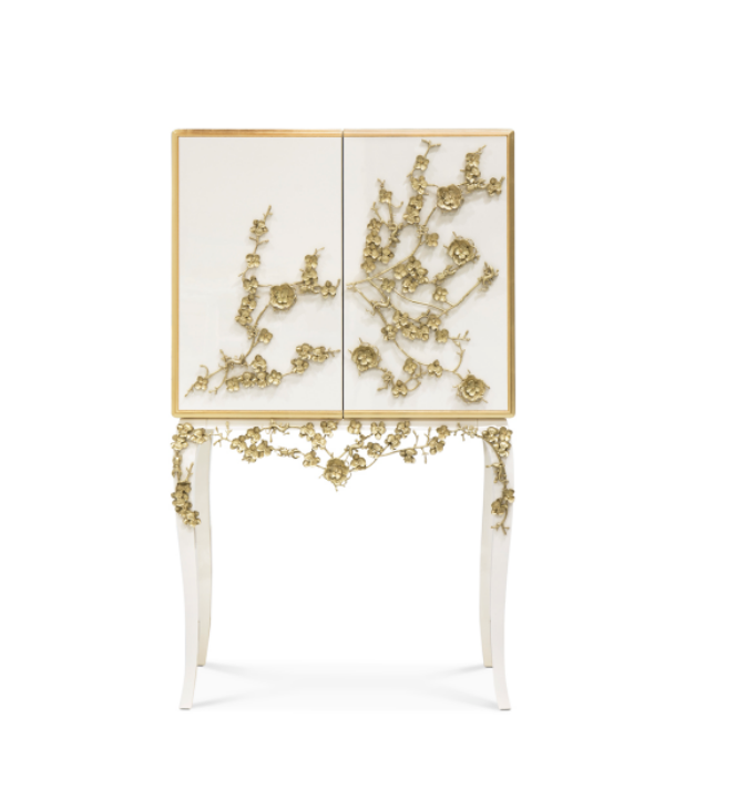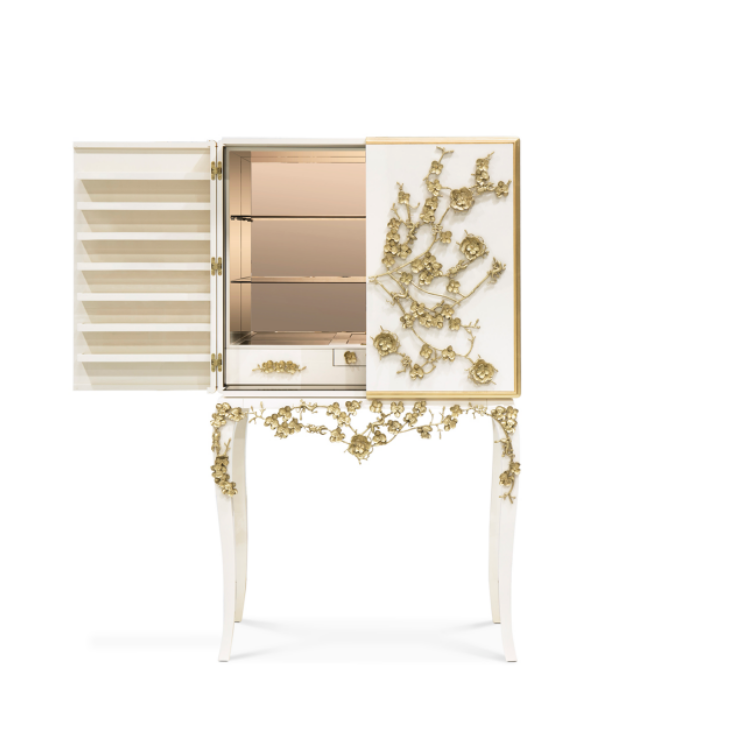 There is a sense of reveal and conceal as KOKET takes a beautiful bar cabinet in high gloss lacquer and adorns it in metal organic lace, revealing a mesmerizing hint of what lies beneath. The chic interior is perfectly designed to store your wine and cocktail accoutrements. The piece also features a long lockable drawer with a secret drawer for your most precious items hidden inside and an inset small drawer with a cedar wood interior for cigars. Open or closed with, this bar cabinet is ready for a glamourous soiree. Cheers!