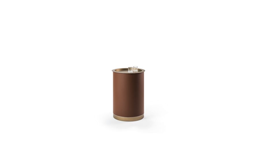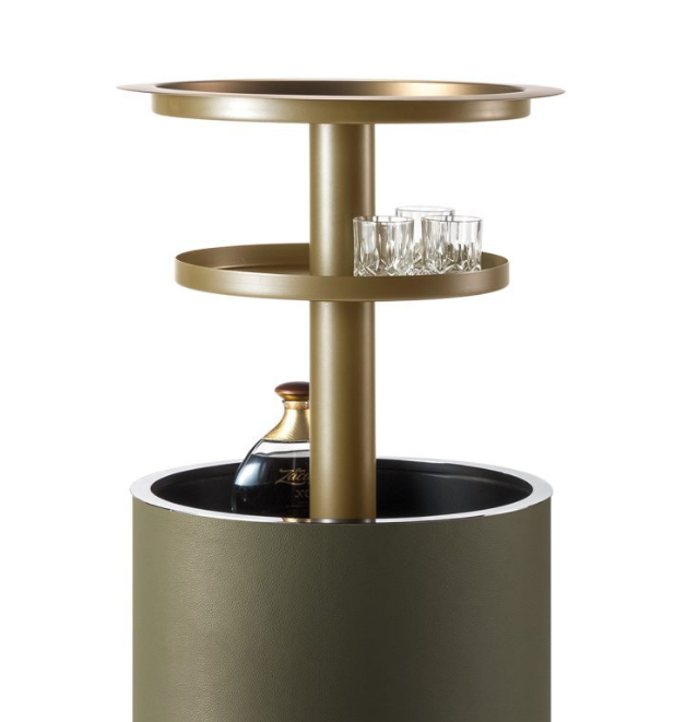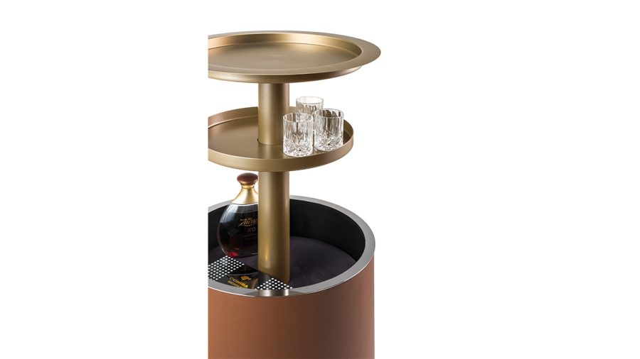Mobile bar con struttura rivestita in pelle e ripiani interni. Meccanismo di sollevamento elettrico con telecomando.