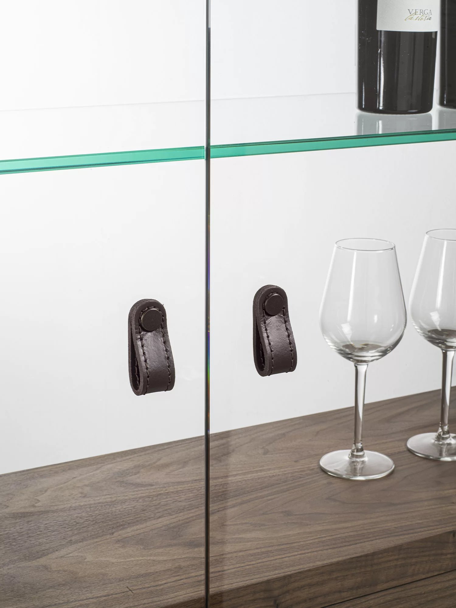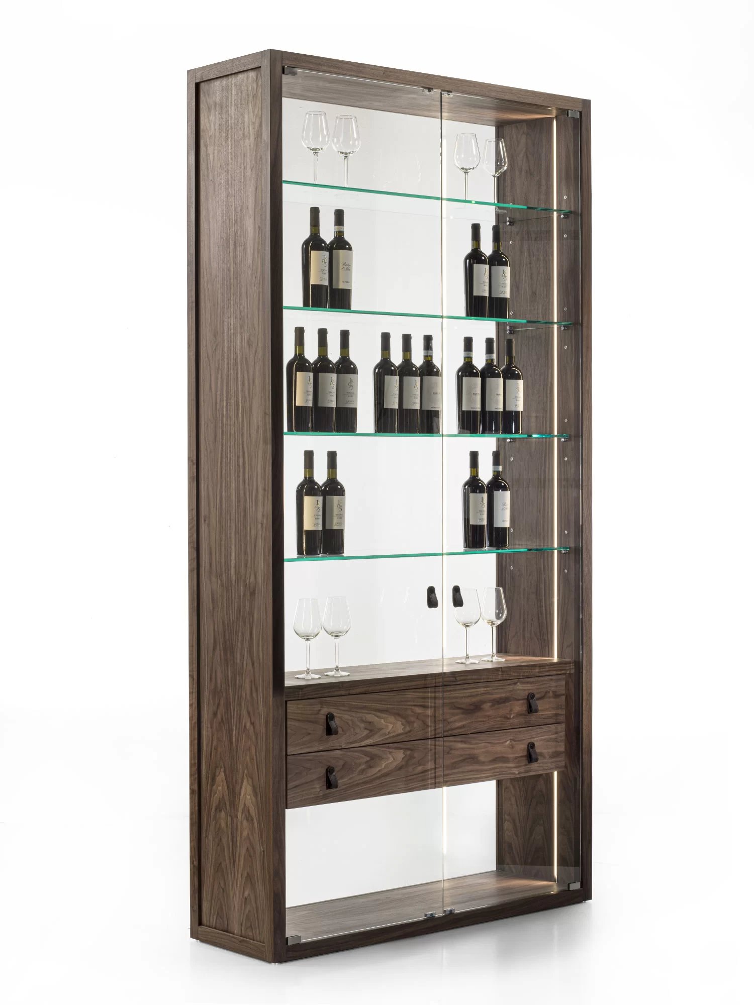 Vetrina alta, tipo espositore, con struttura in legno massello e listellare, caratterizzata da ante, quattro ripiani interni e schienale in vetro. Dotata di cassettiera interna con due cassetti. Maniglie in cuoio ne facilitano l’apertura. Illuminata da un sistema di luci LED verticali.