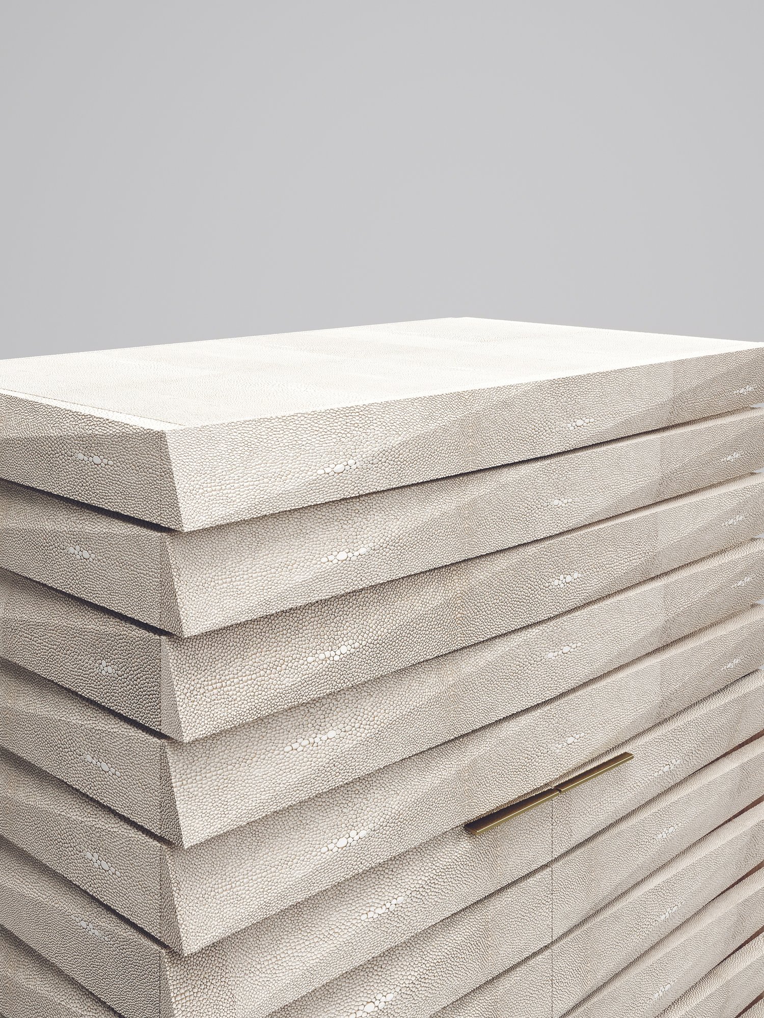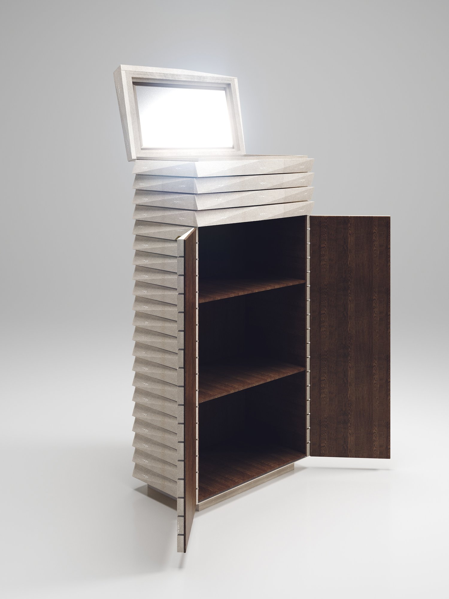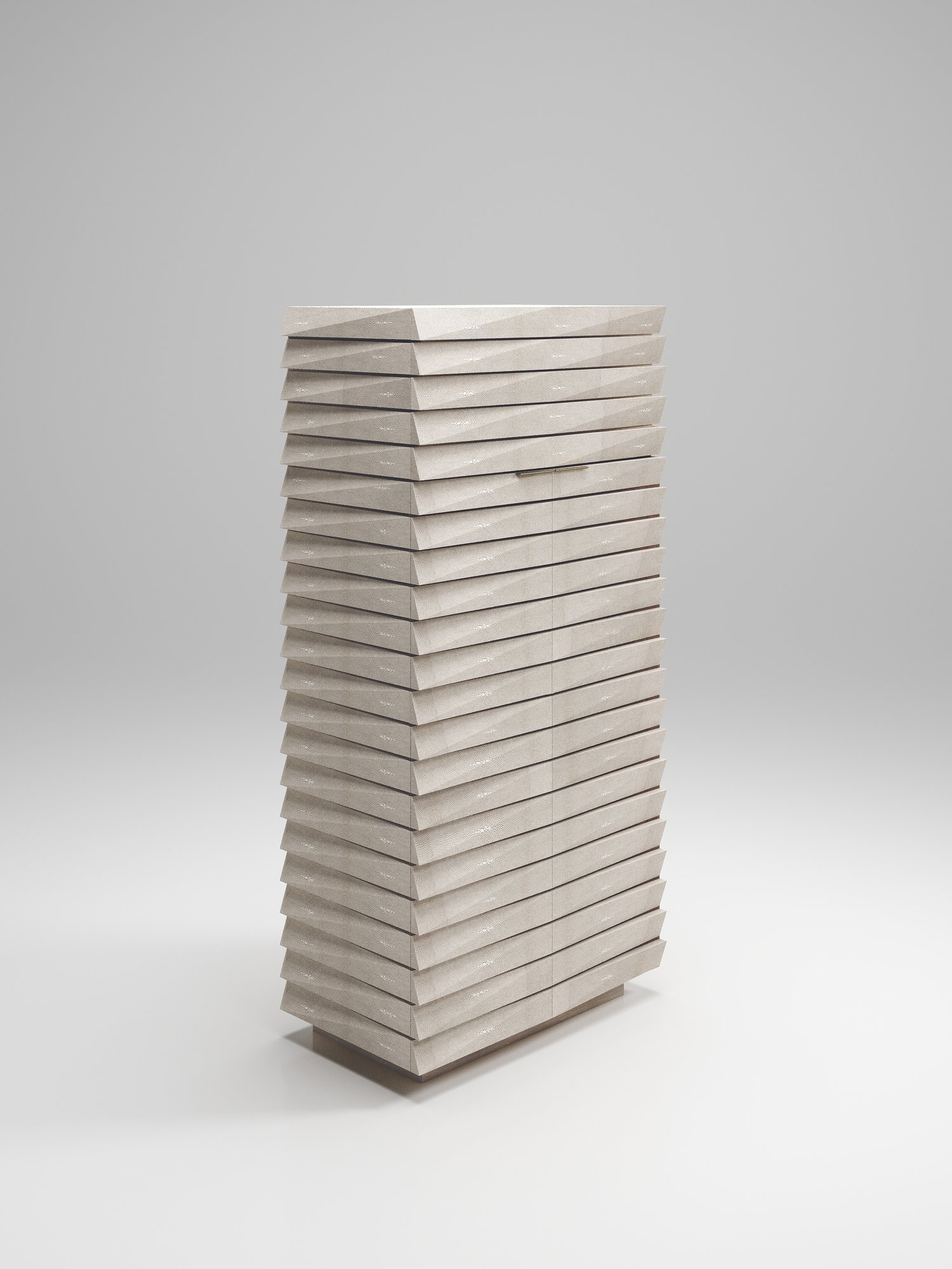The fluted bar cabinet by R & Y Augousti is a sleek and geometric design. The cream shagreen inlaid piece provides great utility while retaining a striking aesthetic with the incredible hand craved fluted details. This piece can be used as a bar cabinet or a jewellery vanity cabinet. This design includes a mirror, 3 open shelves and a a compartment beneath the flap open mirror with a flat bronze-patina brass handle. Available as a chest of drawers, stool and cabinet.