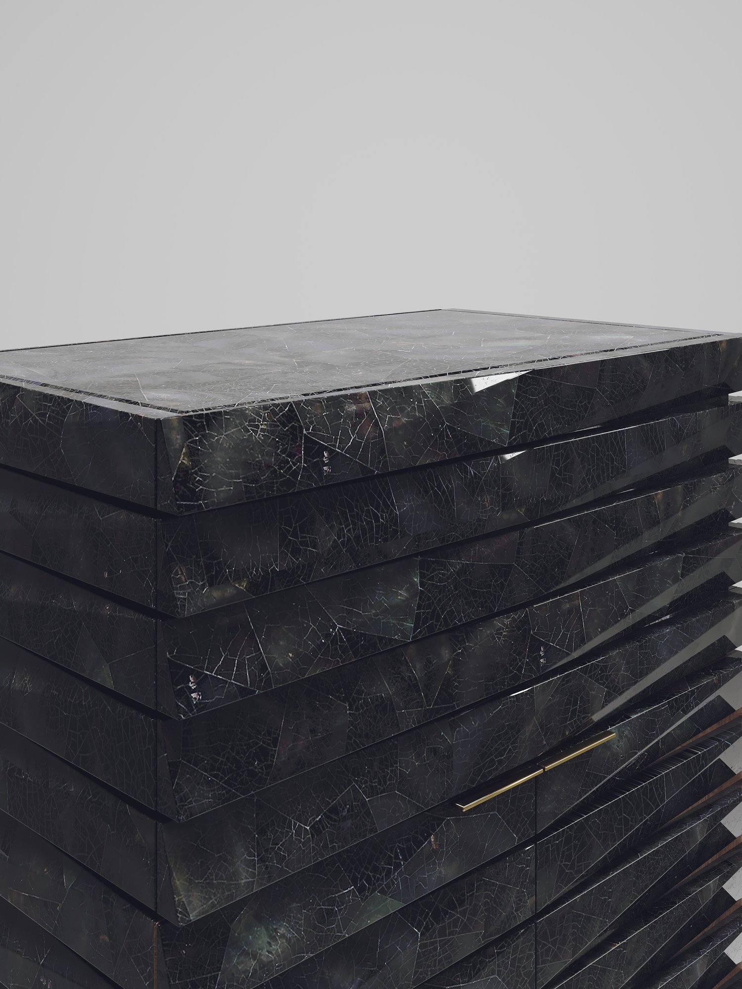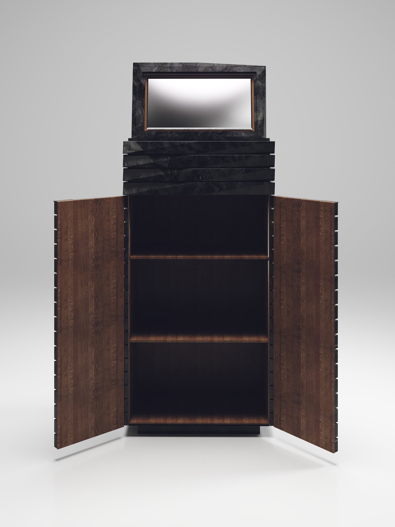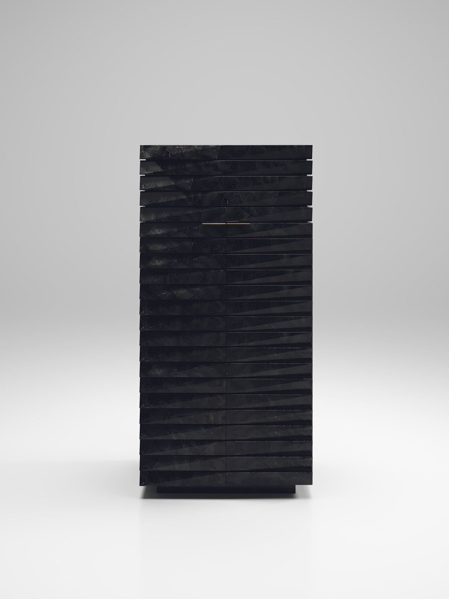 The fluted bar cabinet by R & Y Augousti is a sleek and geometric design. The cream shagreen inlaid piece provides great utility while retaining a striking aesthetic with the incredible hand craved fluted details. This piece can be used as a bar cabinet or a jewellery vanity cabinet. This design includes a mirror, 3 open shelves and a a compartment beneath the flap open mirror with a flat bronze-patina brass handle. Available as a chest of drawers, stool and cabinet.