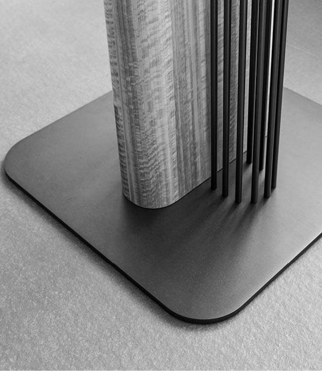 Bar table with top in inlaid Tasmanian curly Eucaliptus veneer with high gloss polyester finish. Base in combination of satin grey nickel stainless steel and Tasmanian curly Eucaliptus veneer with high gloss polyester finish.