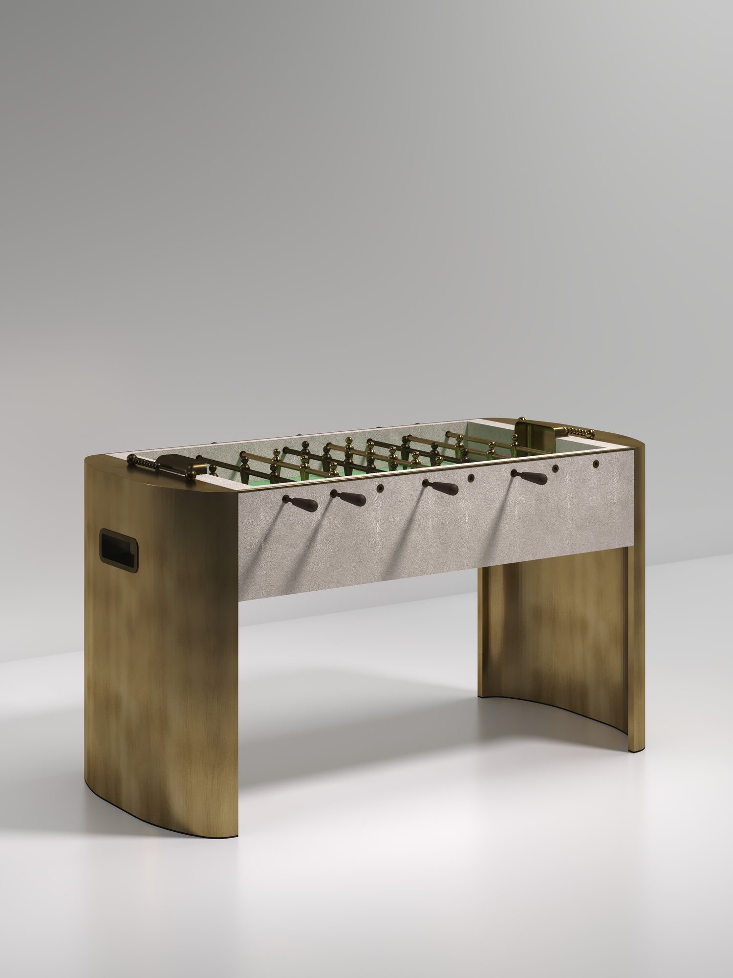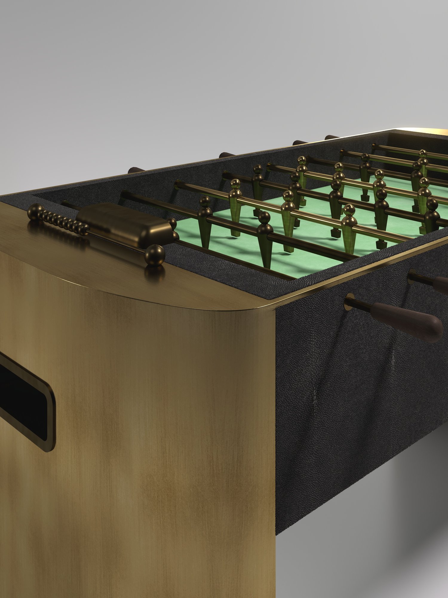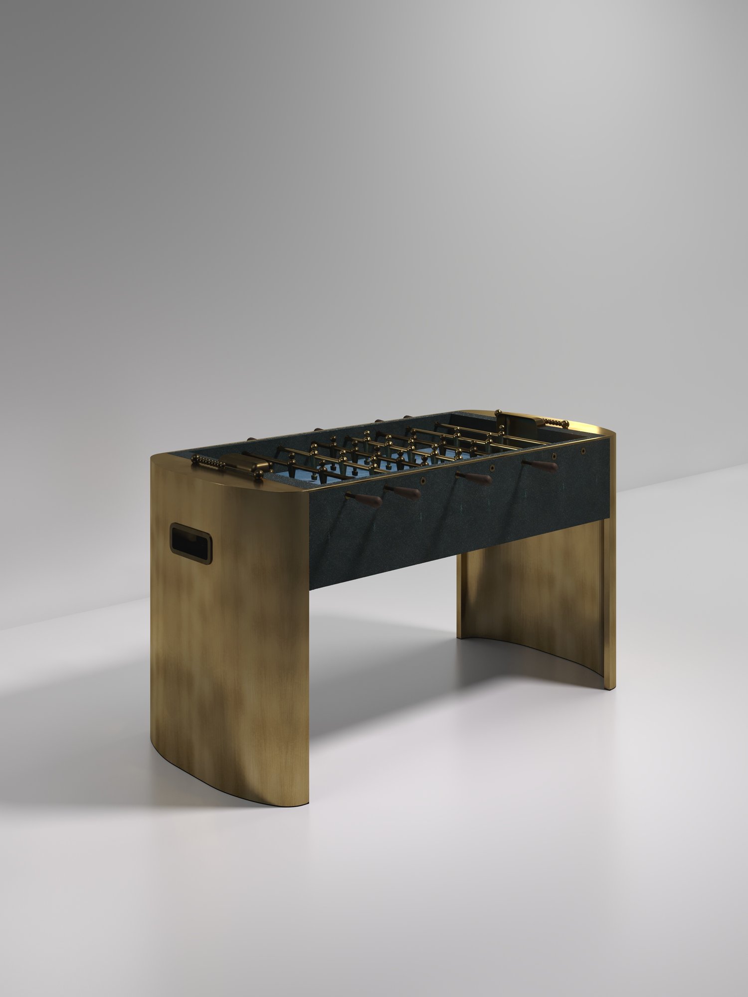 The Ellipse Foosball Table by R&Y Augousti is a truly luxurious statement piece for your home. The central cream shagreen game part is nestled in between stunning curved bronze-patina brass legs, creating the ultimate luxury game table. The foosball pieces are all in brass and inner table in a green velvet felt. Available in other finishes and variations.