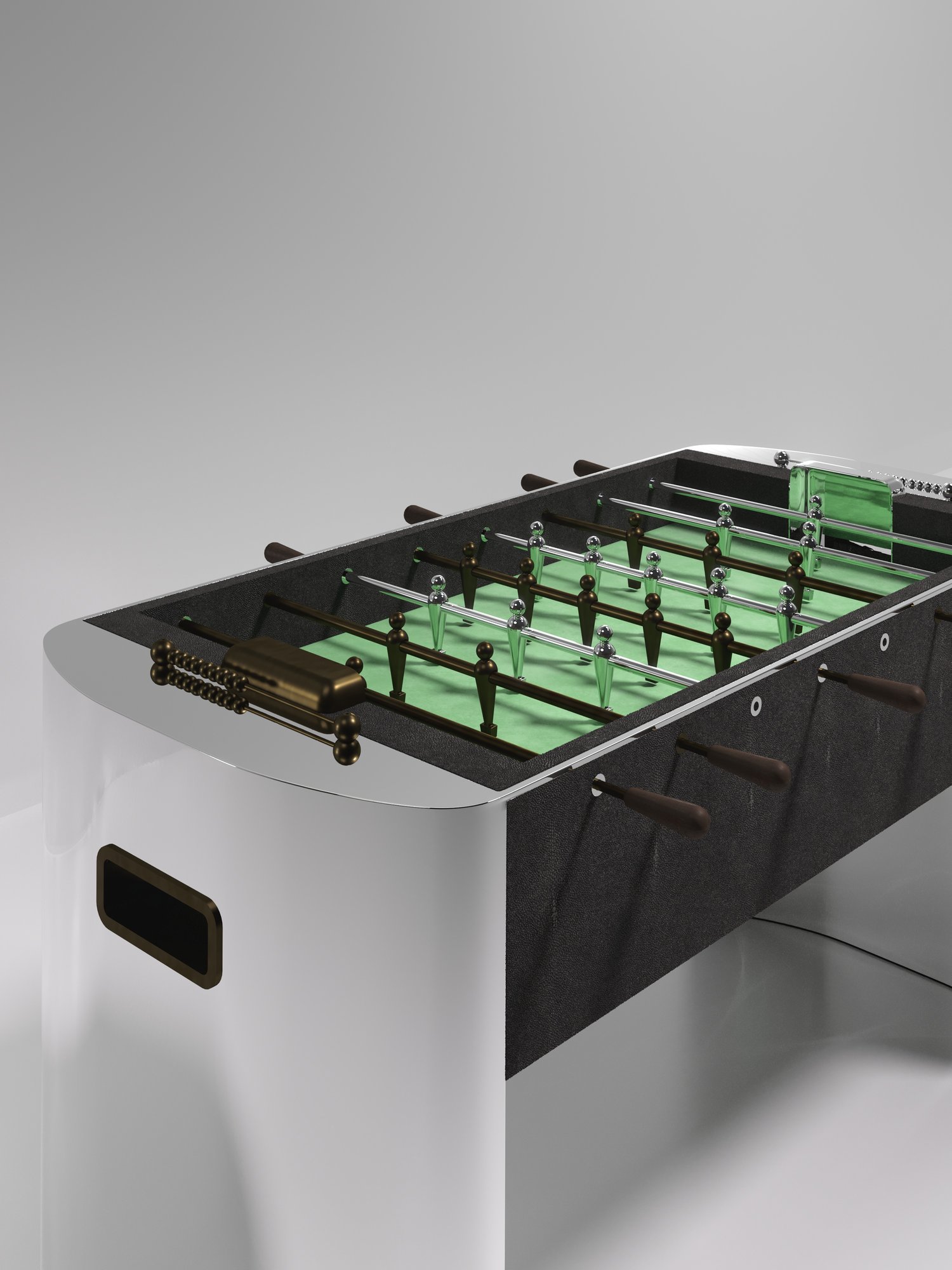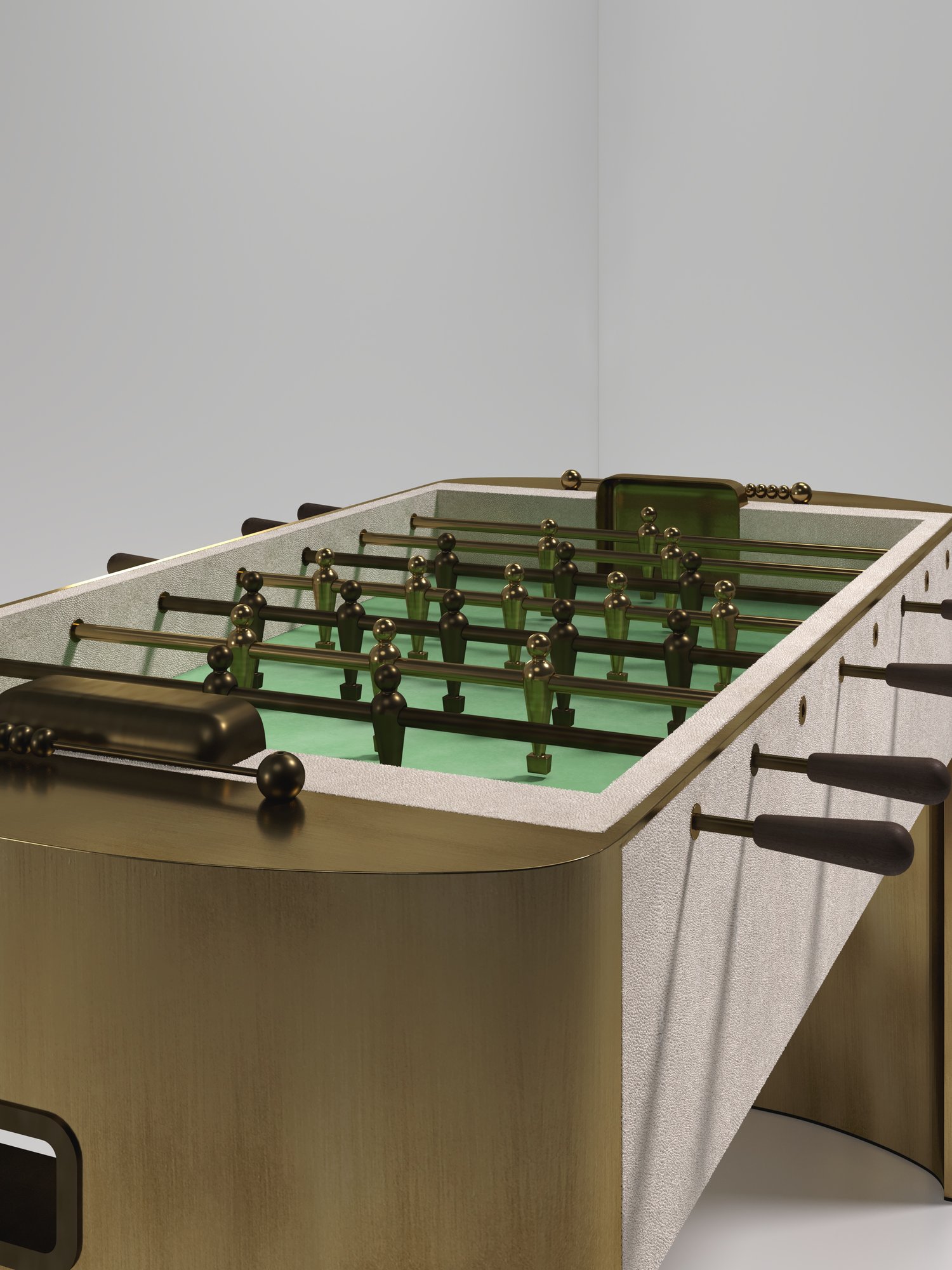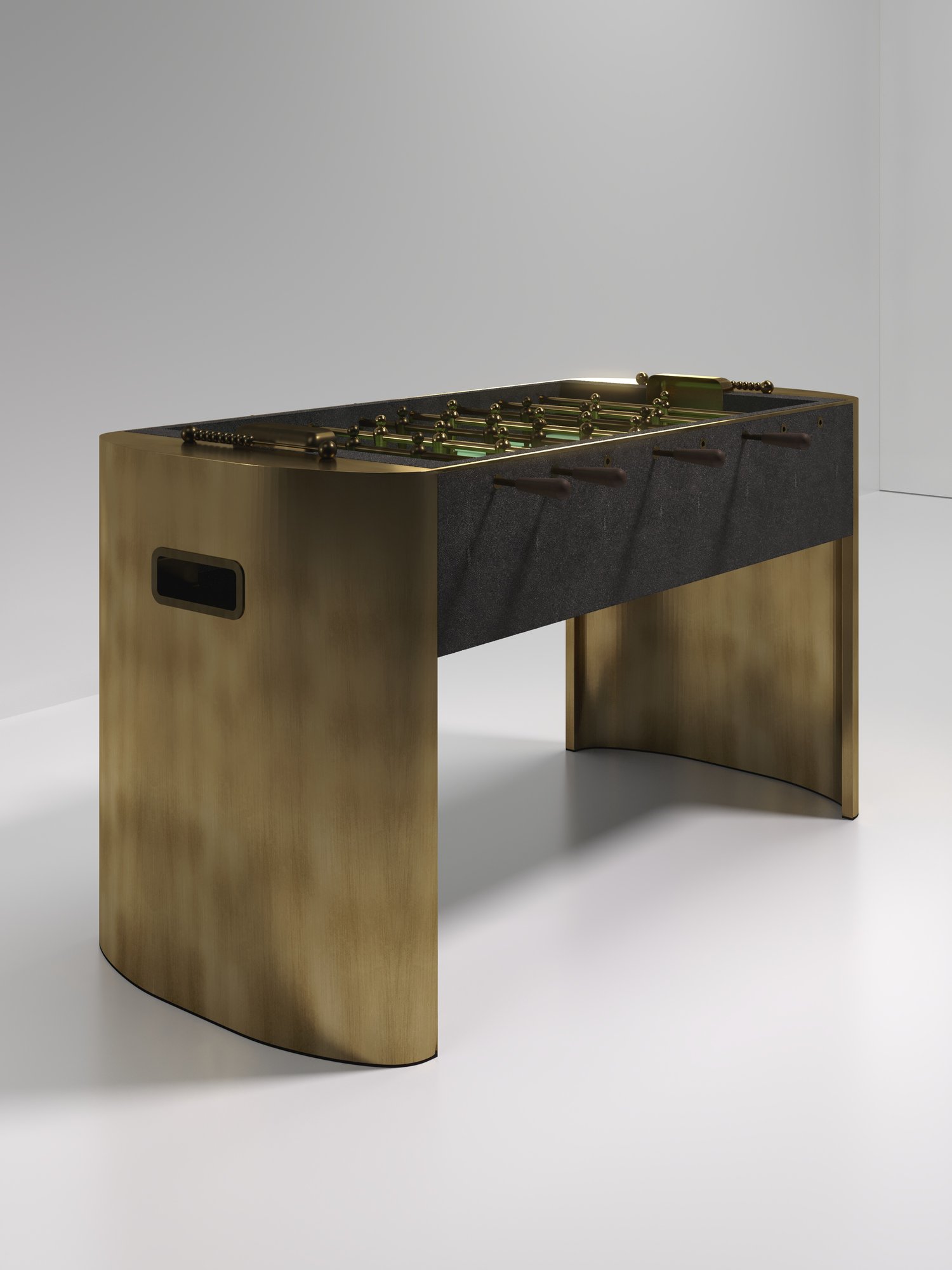 The Ellipse Foosball Table by R&Y Augousti is a truly luxurious statement piece for your home. The central cream shagreen game part is nestled in between stunning curved bronze-patina brass legs, creating the ultimate luxury game table. The foosball pieces are all in brass and inner table in a green velvet felt. Available in other finishes and variations.