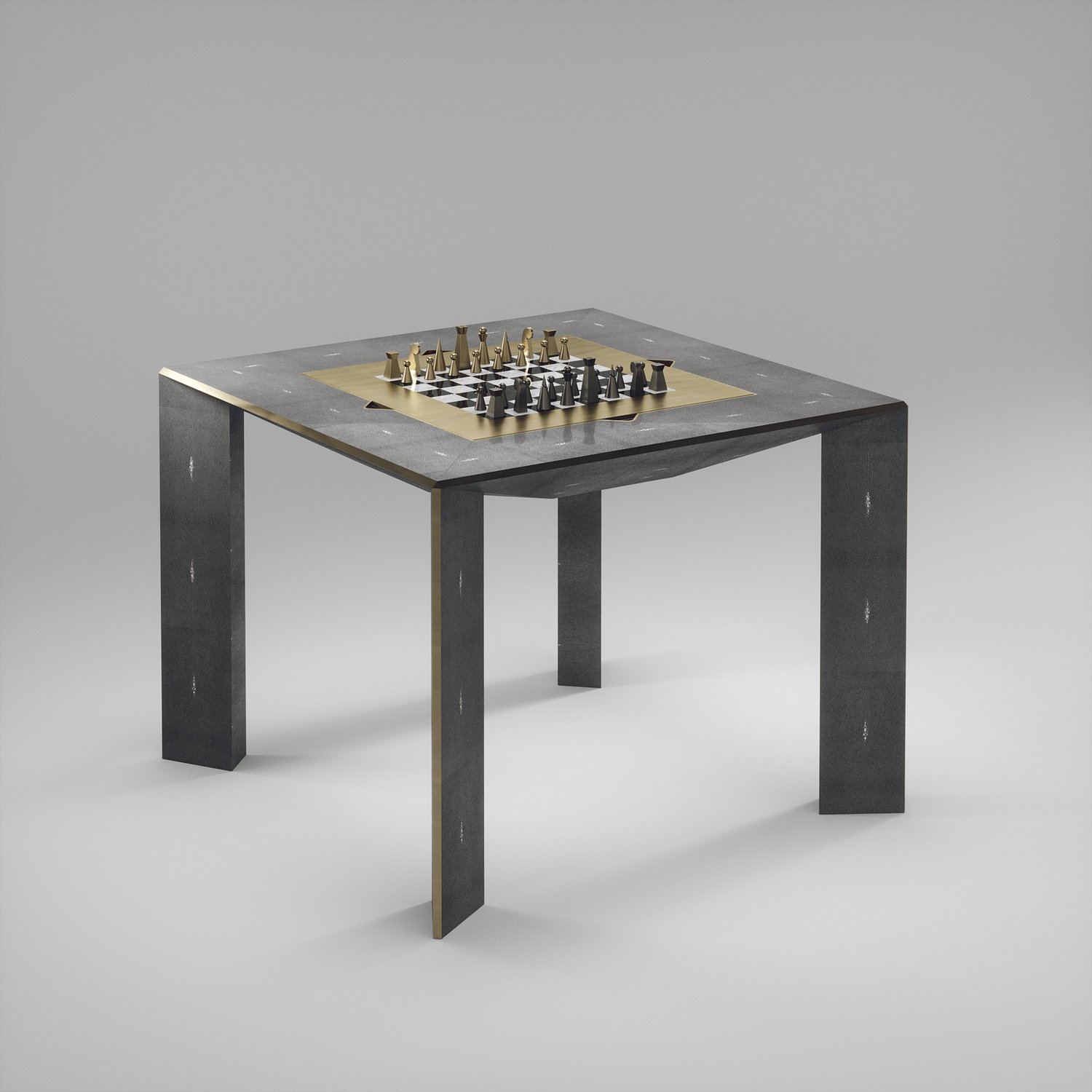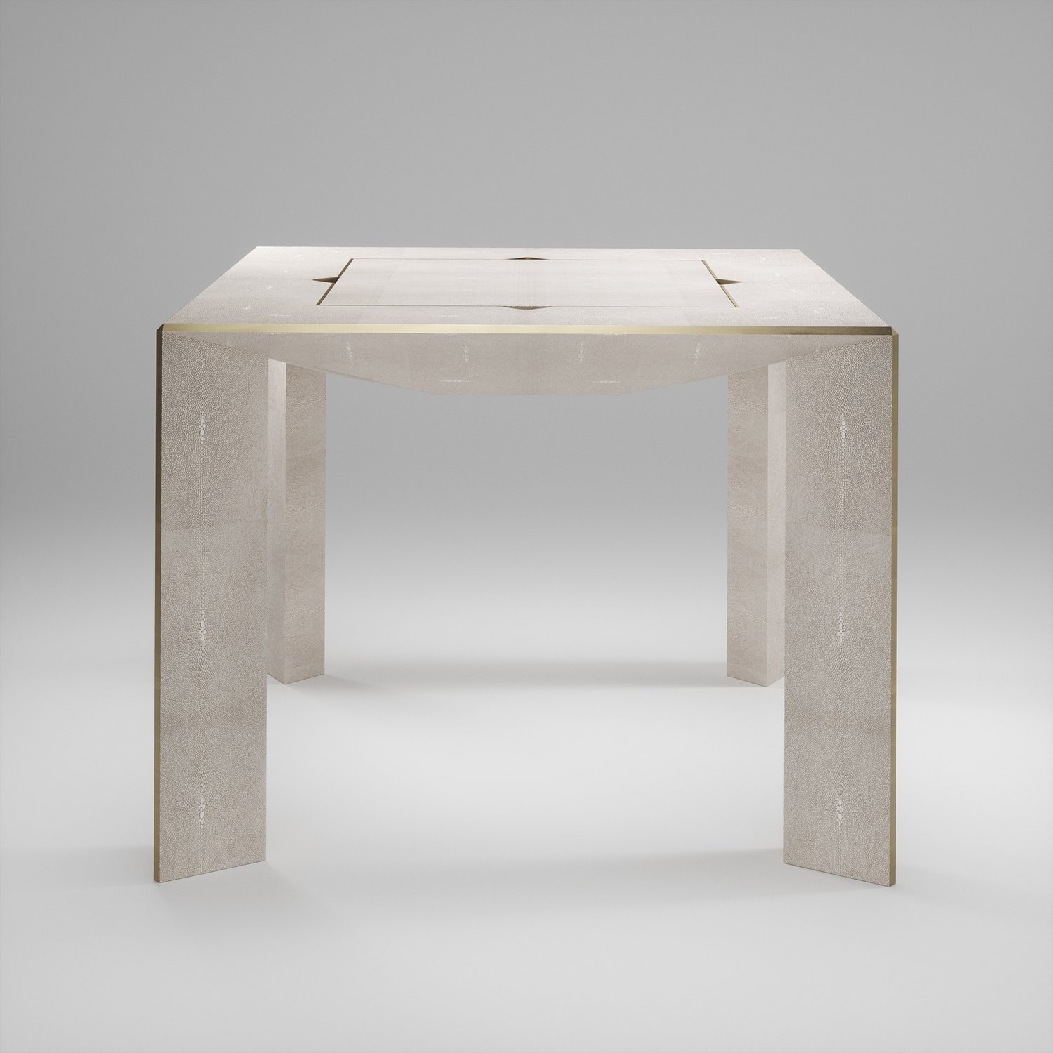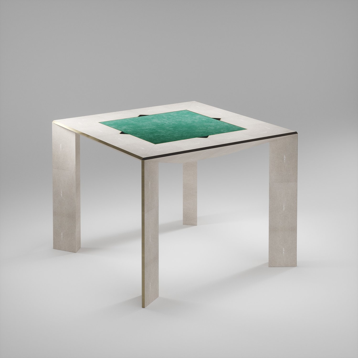 The 4 in 1 Parsons game table R&Y Augousti is a truly luxurious statement piece for your home. The clean lines of the overall piece in cream shagreen, accentuated by the sleek bronze-patina brass details on the legs make it versatile for any space. This piece includes a complete game package set with interchangeable boards that stack on top of each other in the centre of the table; one for chess, one for backgammon, a green velvet bard to play your favourite card games and a plain shagreen board if one were to use it as a beautiful centre piece.