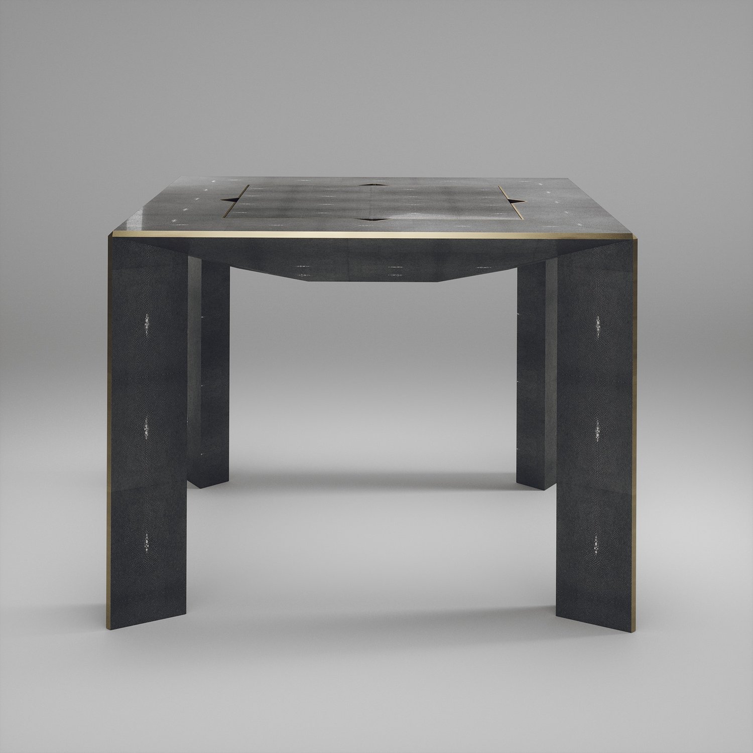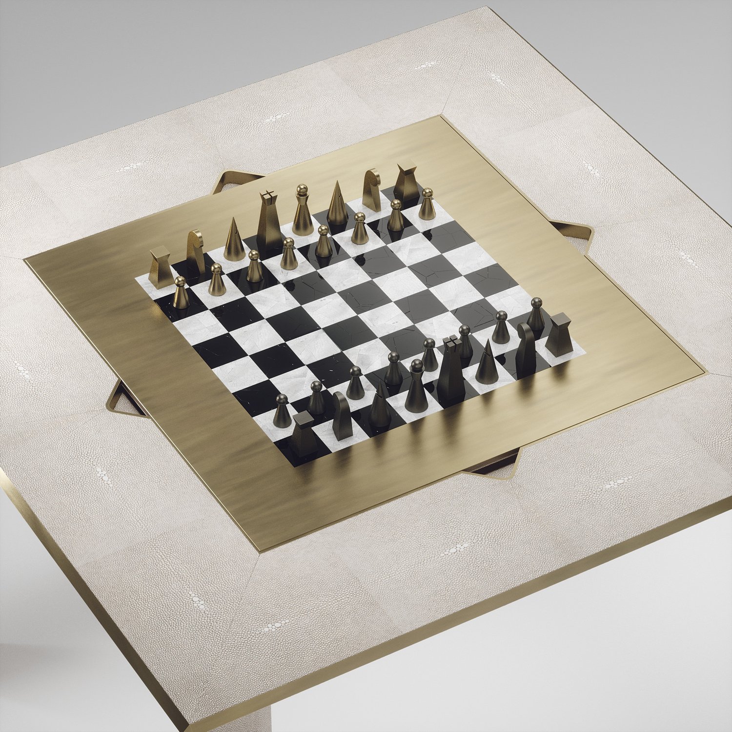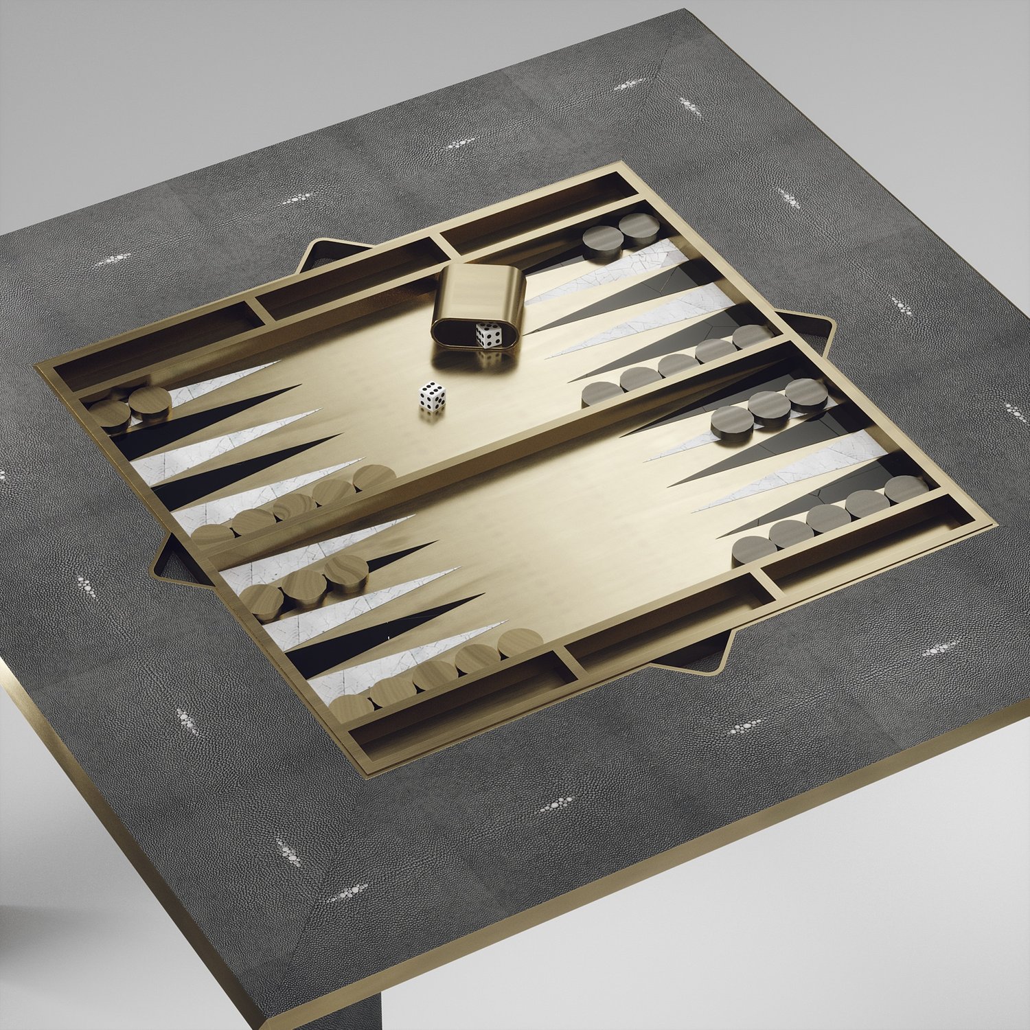 The 4 in 1 Parsons game table R&Y Augousti is a truly luxurious statement piece for your home. The clean lines of the overall piece in cream shagreen, accentuated by the sleek bronze-patina brass details on the legs make it versatile for any space. This piece includes a complete game package set with interchangeable boards that stack on top of each other in the centre of the table; one for chess, one for backgammon, a green velvet bard to play your favourite card games and a plain shagreen board if one were to use it as a beautiful centre piece.