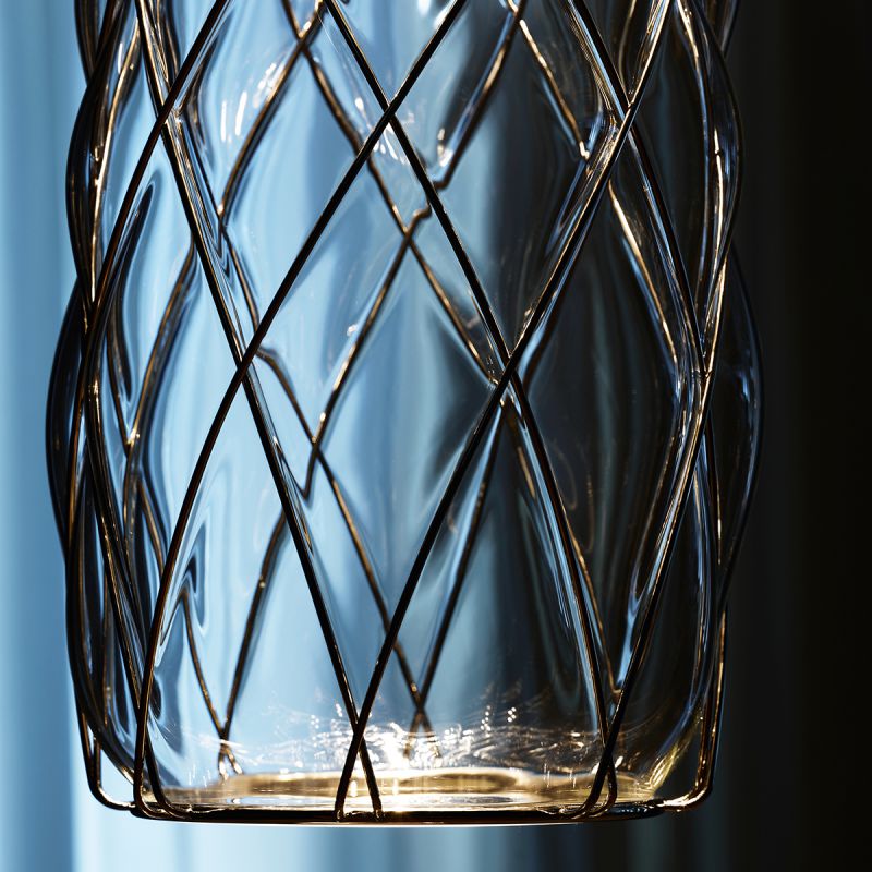 Pinecone系列的外型是一顆松果,是運用古老的籠狀吹制玻璃技術吹制而成的。Navone在金屬籠增加透明版,呈現出雙重結構,增加了景觀效果,夜幕降臨時燈的圖案在周圍表面呈現出萬花筒般的陰影效果。