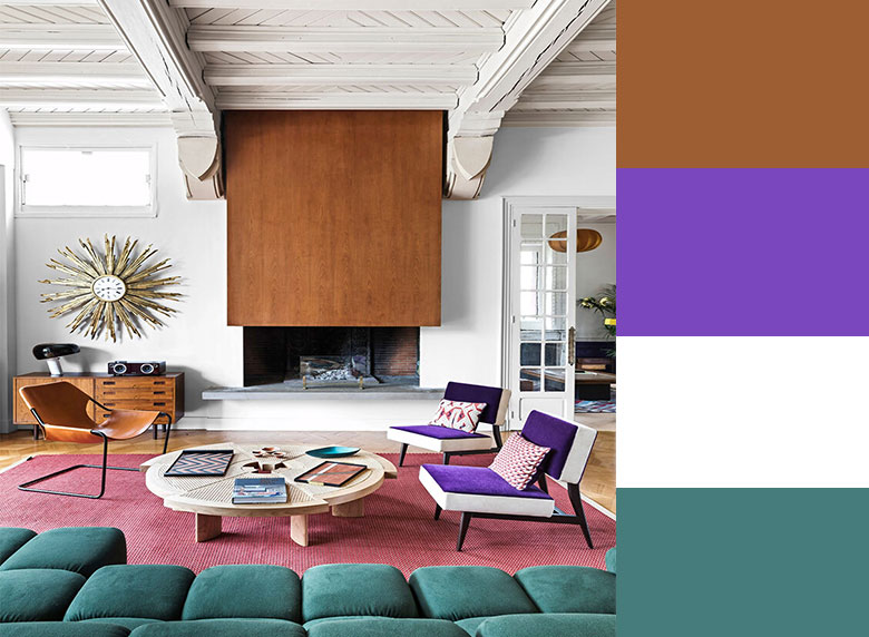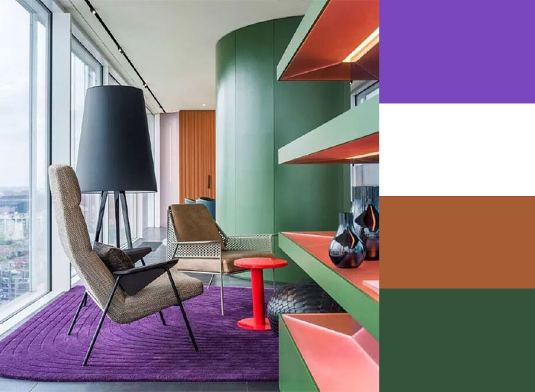 空間的跳色設計中,紫色往往是位“調解員”。在彩色的空間里,一抹紫色的身影可以中和過于活潑的氣氛,起到適度冷靜的作用。而在黑灰色空間里,紫色又可以輕而易舉的將原本沉悶的氣氛打破。