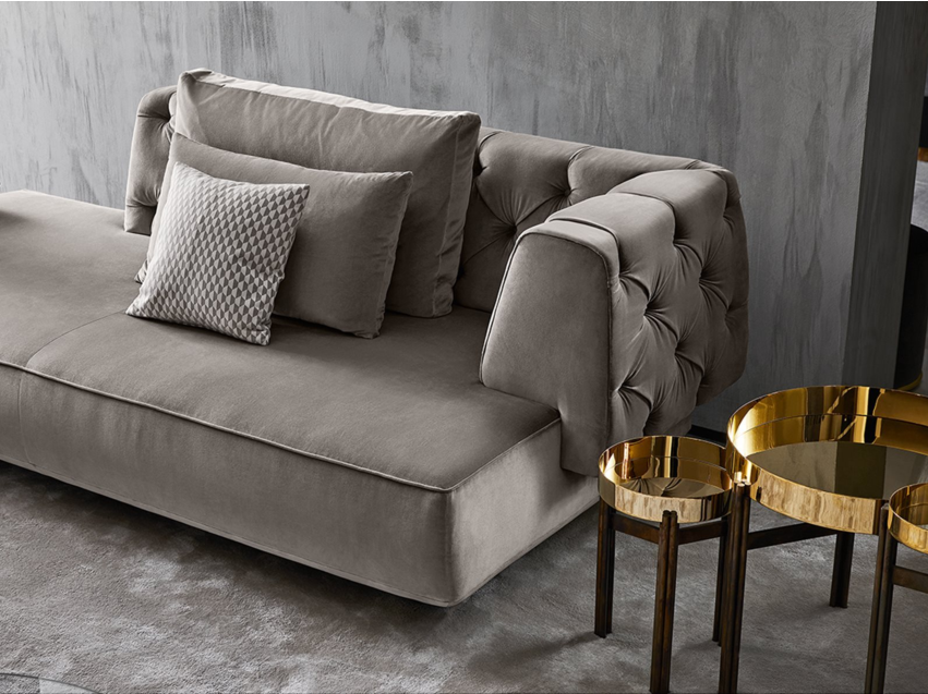 Fiona沙發依舊用了奢華感十足的天鵝絨面料,靠背上的英式紐扣結增添了沙發的設計感,實木的拐角茶幾又增加了實用性。