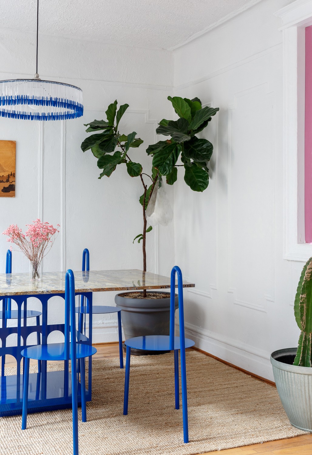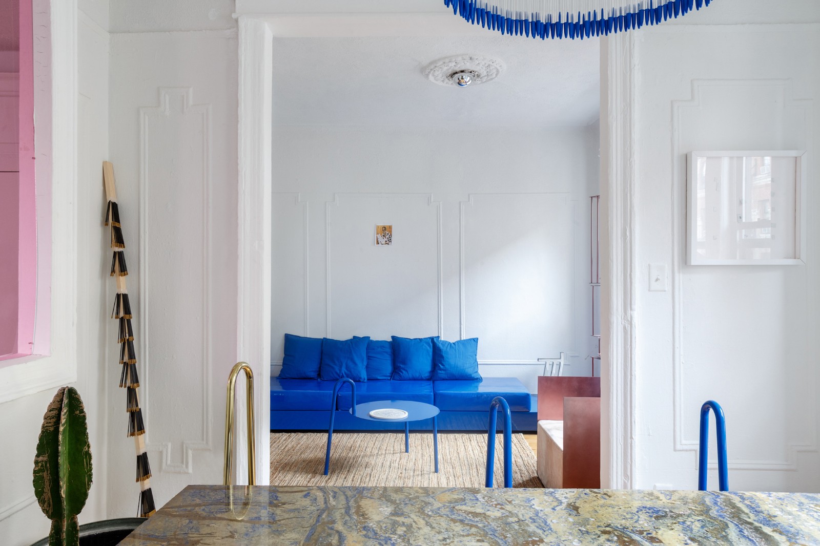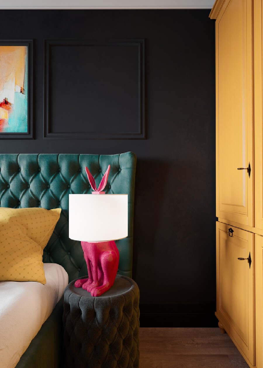 在臥室的設(shè)計(jì)中總會出現(xiàn)藍(lán)色的身影,自帶安靜濾鏡的它,是最助眠的顏色。大片的道奇藍(lán)十分富有戲劇性,藍(lán)色花邊的燈和抱枕讓空間看起來和諧統(tǒng)一。點(diǎn)綴的粉色色塊讓空間呈現(xiàn)了不同折面的裝飾效果,同時(shí)也為過于理性的藍(lán)色增加了感性色彩。