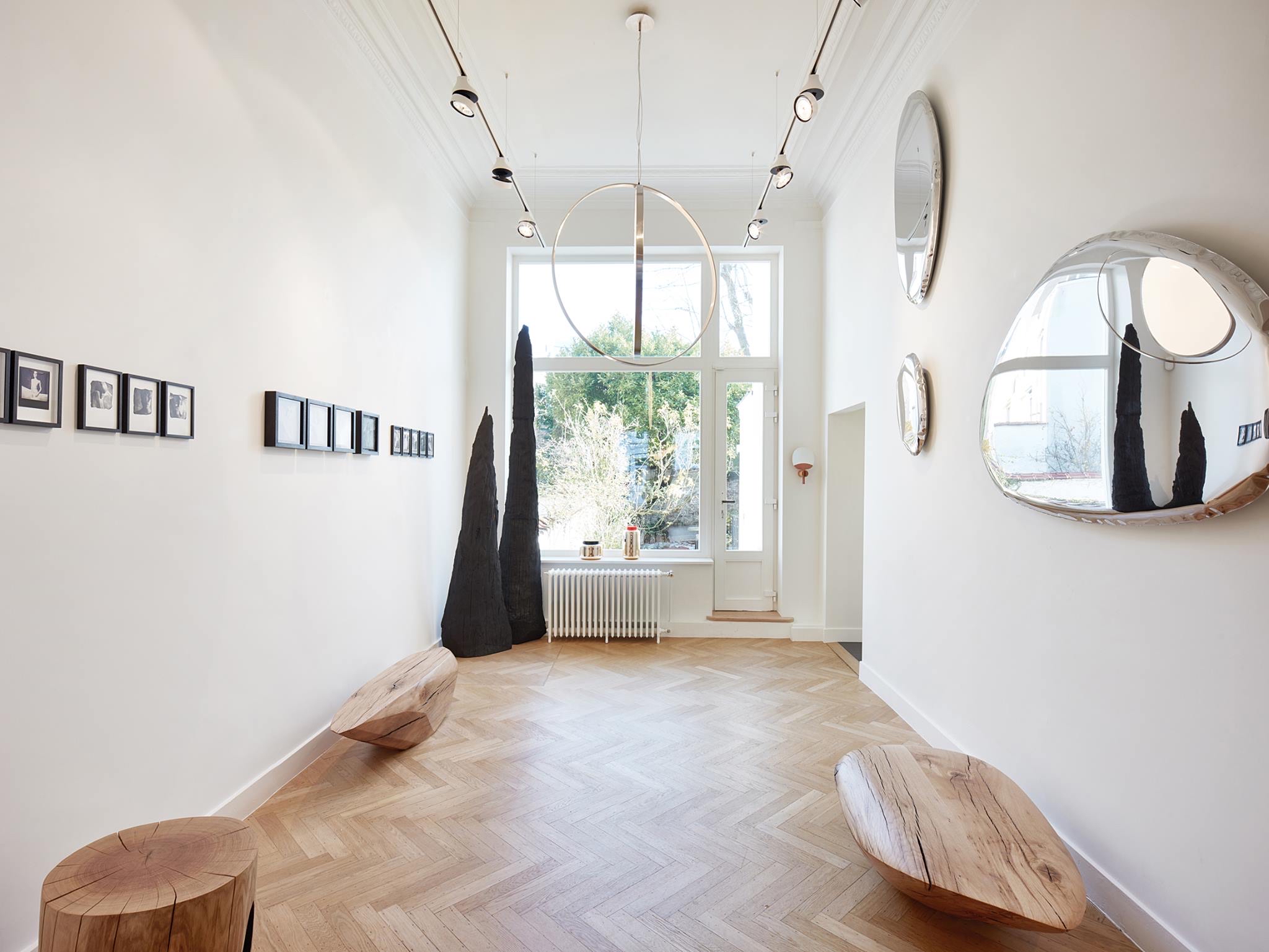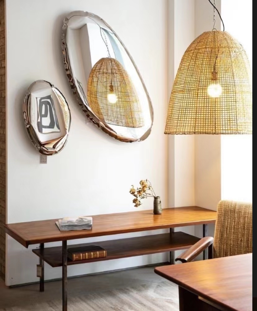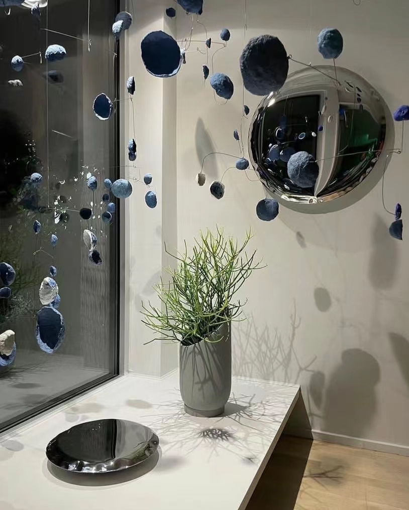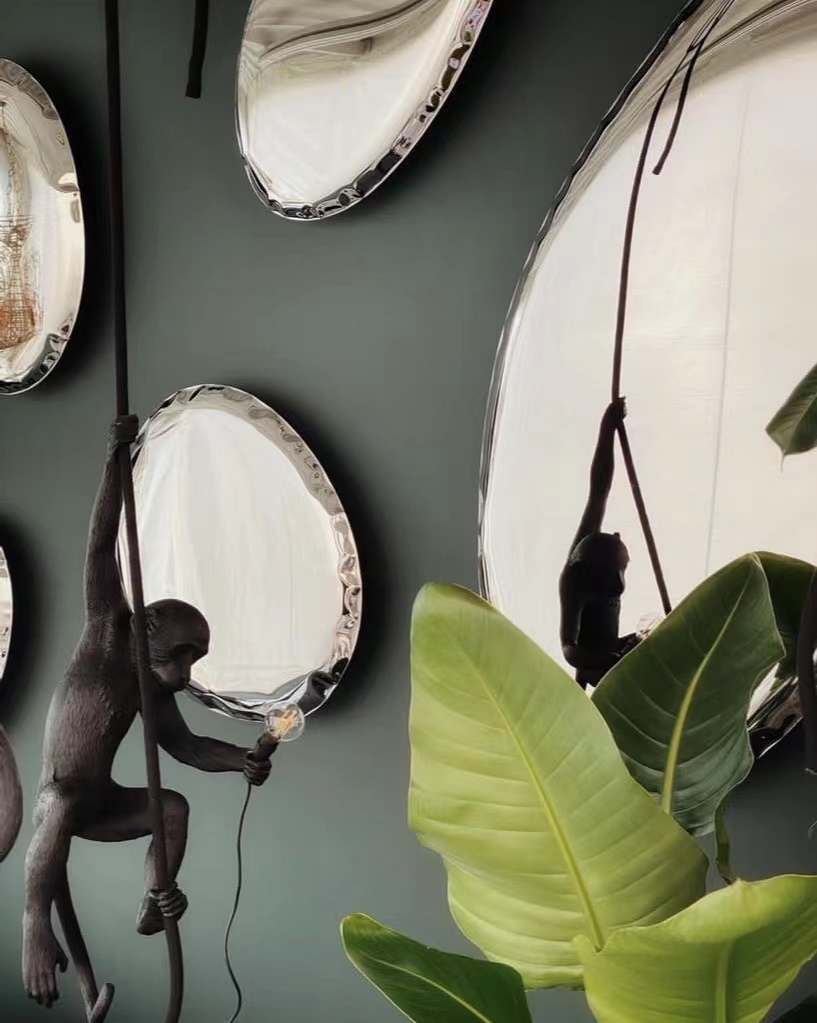 TAFLA O is a series of bionic mirrors of organic shapes inspired by natural shapes of liquid drops. Mirrors from the TAFLA collection are made of stainless steel polished to a high gloss and come in seven different sizes. They can be arranged in an artistic personalized composition or exposed on a wall as a single sculpture-like mirror. They will fit contemporary private spaces, as well as restaurants, bars and hotel rooms. You can enjoy the charm of the classic Inox finish or a colour selected from the available palette. The TAFLA O mirror looks mesmerizing as a single object, but also in layouts that make up constellations of them.