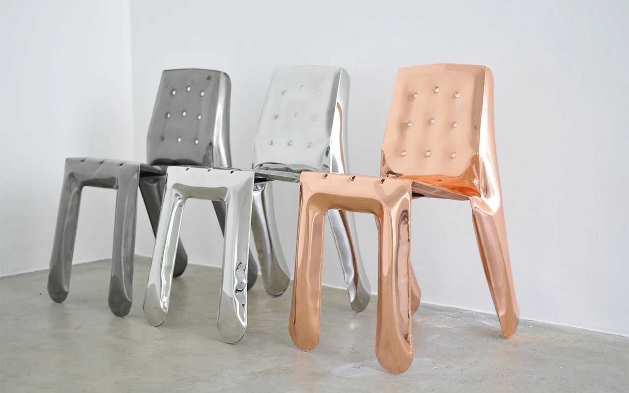A development of the limited edition Chippensteel 0.5 chair – available in new colours. It still offers a unique material experience but the shape of the chair has been slightly redesigned to allow a mass-production. The chair has been uniquely processed and produced in FiDU technology using bending properties of steel sheets.